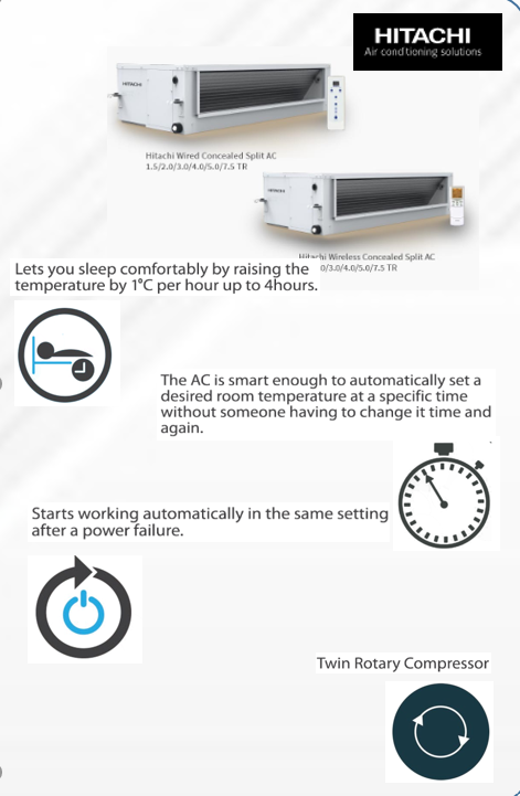 - Cool, Fan, Dry, Auto & Powerful for customized cooling available in Hitachi Cordless concealed unit & 2 Modes of operation – Cool & Fan for customized cooling are available in Hitachi Wire Concealed unit.
